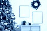 Christmas tree with festive decorations and wooden cabinet near white brick wall