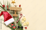 Santa hat, palm leaves and wooden airplane on beige background. Christmas vacation concept