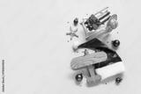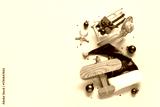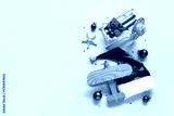 Santa hat, toy deckchair, starfish and wooden airplane on blue background. Christmas vacation concept