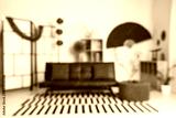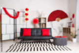 Blurred view of modern living room with black sofa and decorations for Chinese New Year celebration