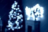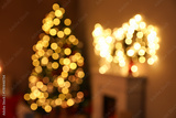 Different decorations and glowing garland on fireplace near Christmas tree at night, blurred view