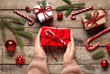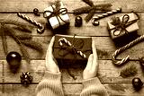Female hands with Christmas gift boxes, fir tree branches and decor on wooden background