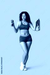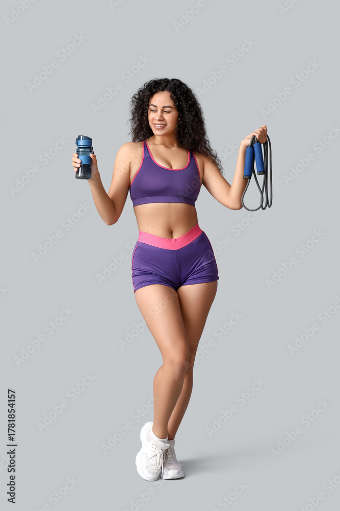 Sporty young African-American female coach with jumping rope and water bottle on white background