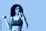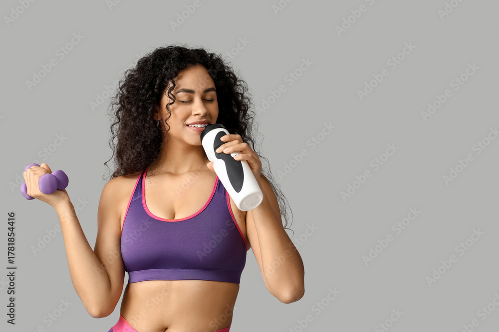 Sporty young African-American female coach with water bottle and dumbbells on white background
