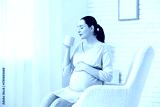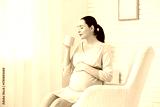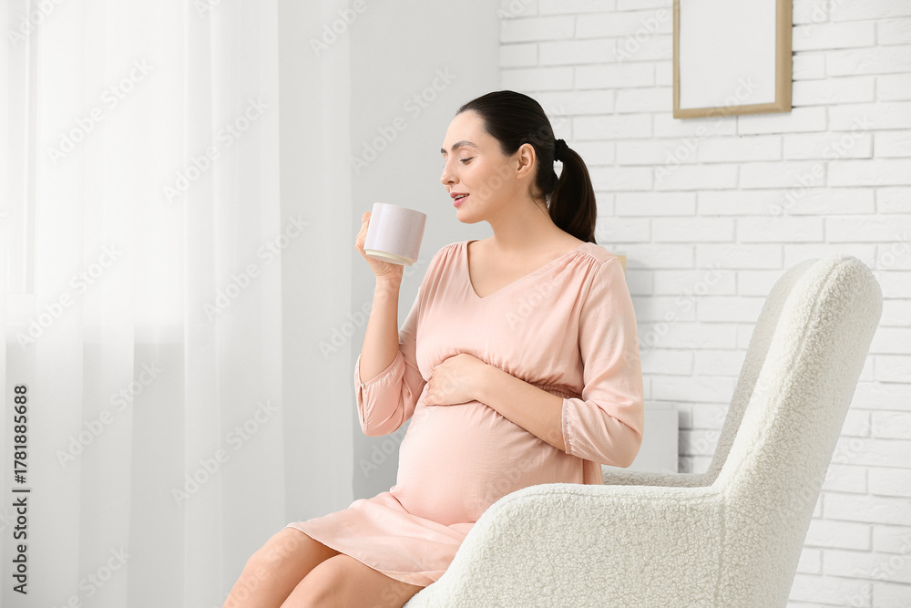Beautiful young pregnant woman with cup of tea sitting in armchair in living room