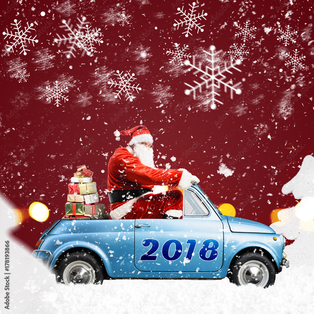 Santa Claus on car delivering Christmas or New Year gifts at snowy blue background