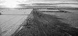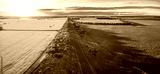 Aerial panorama of rural road passing through agricultural land in Australian countryside at sunset