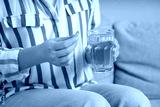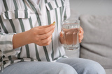 Woman with vitamin E pill and glass of water sitting on sofa at home, closeup