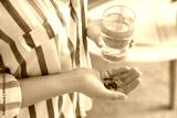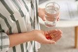 Woman with pile of vitamin E pills and glass of water at home, closeup