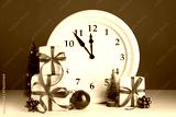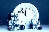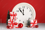 White clock with Christmas decorations and gift boxes on grey table against red background