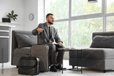 Young businessman with laptop and luggage waiting for his flight in airport lounge