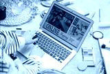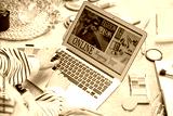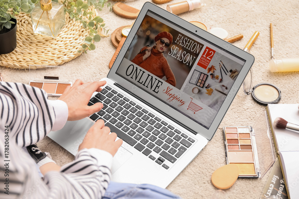 Woman with laptop, makeup products and accessories shopping online on beige carpet, closeup