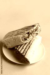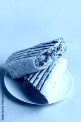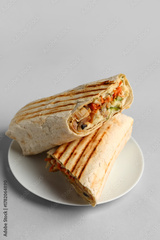 Plate with tasty shawarma on grey background