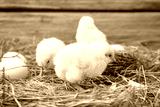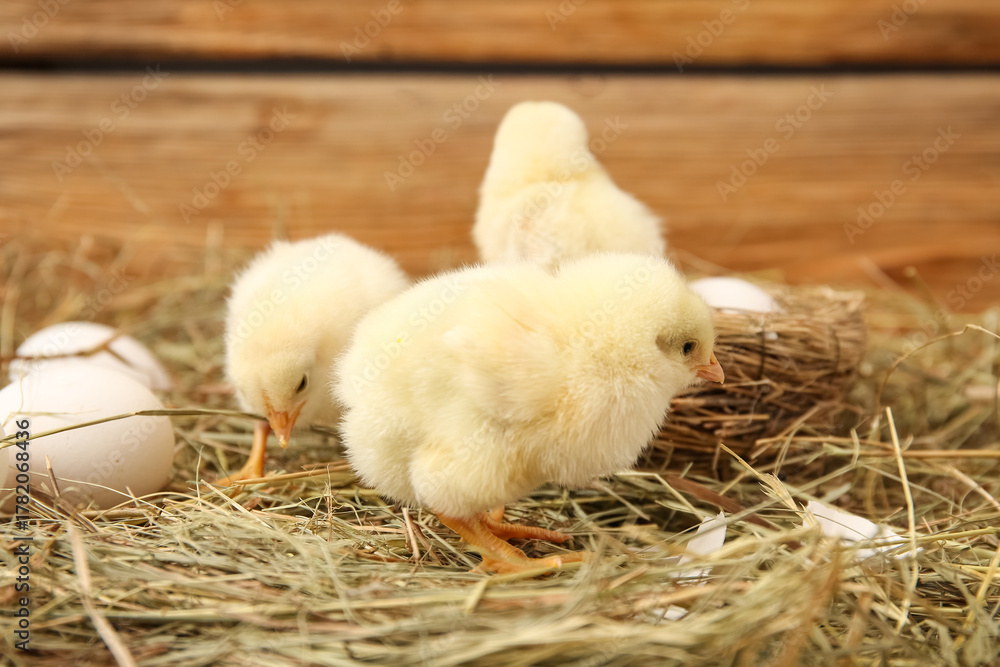 Nest with cute little chicks and egg on wooden background