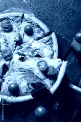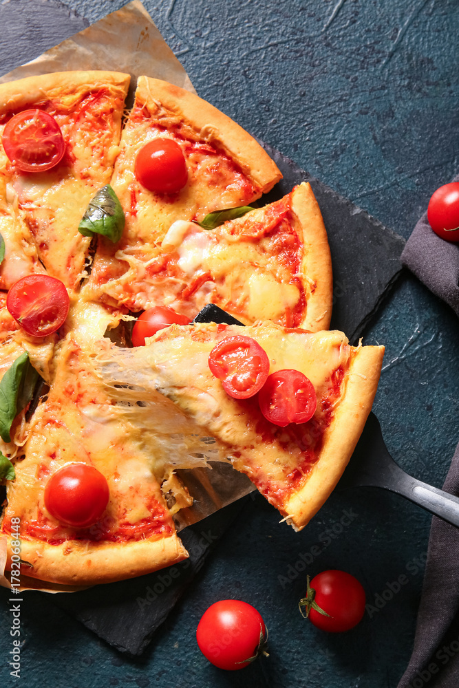 Board with tasty pizza margarita on dark background