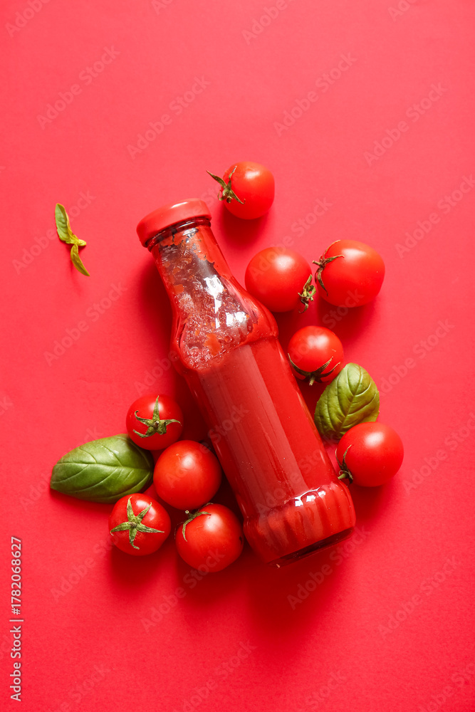 Glass bottle of ketchup and tomatoes on red background