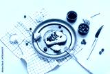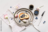 Plate with delicious jam toasts, blueberries and flowers on grey background