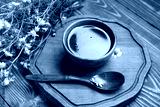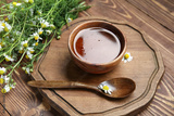 Board with bowl of honey and fresh chamomile flowers on wooden background, closeup