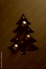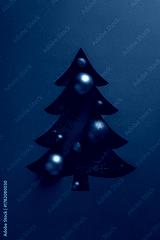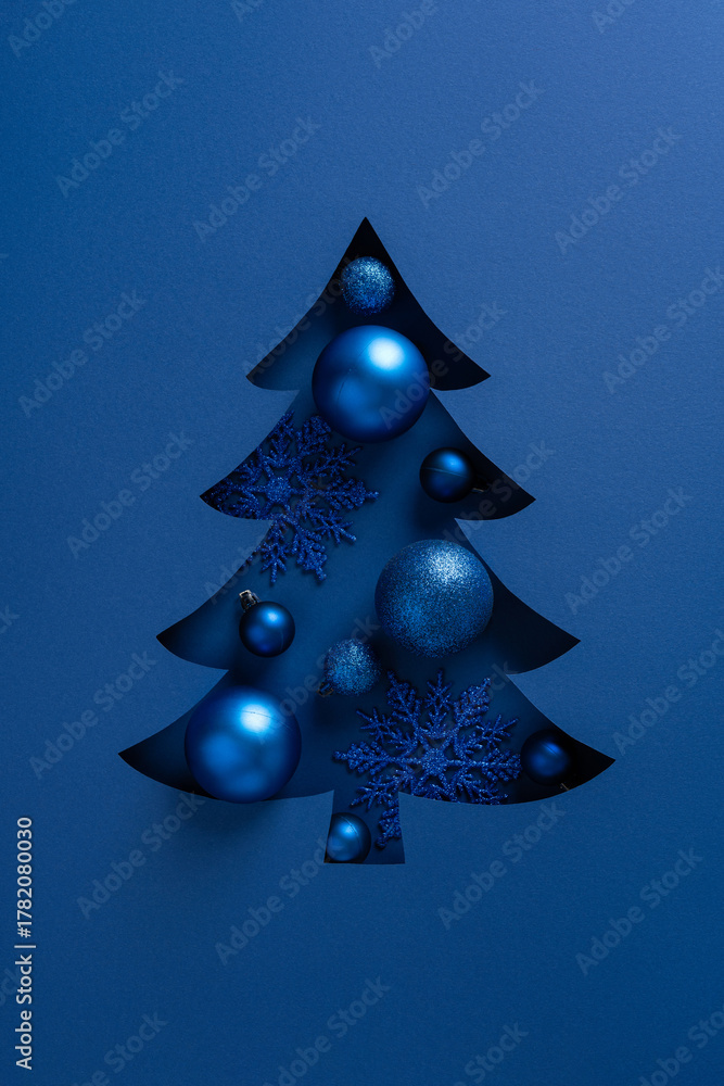 A vertical blue Christmas tree cutout decorated with metallic ornaments and snowflakes against a deep blue backdrop