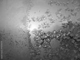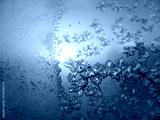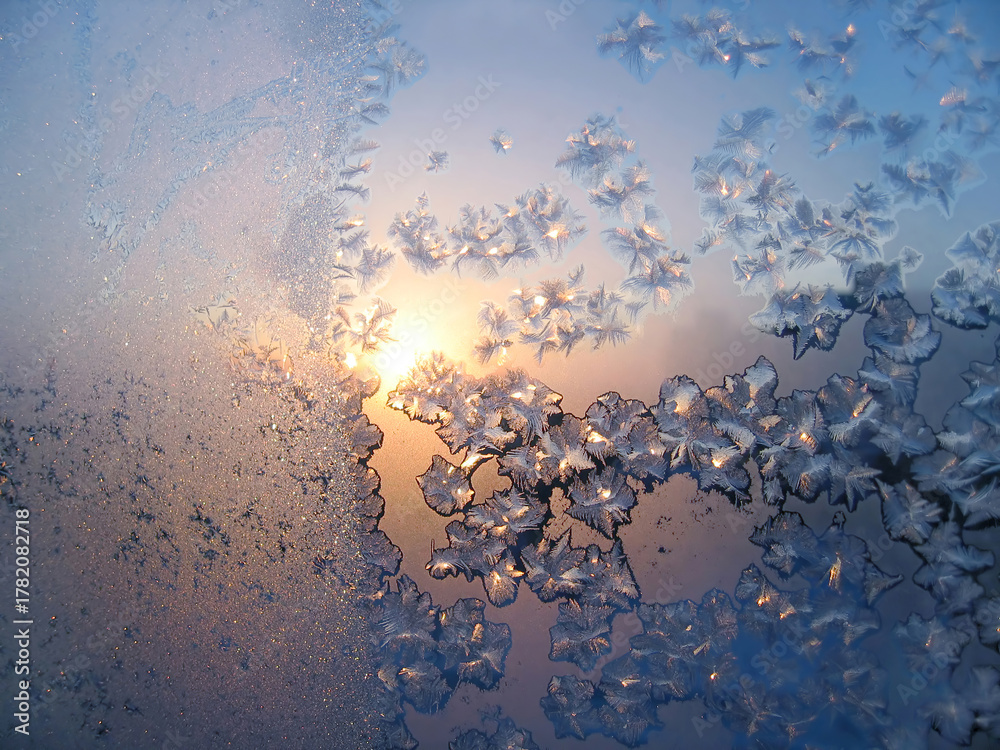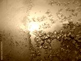 Beautiful ice pattern and sunlight on winter window glass, close-up natural background