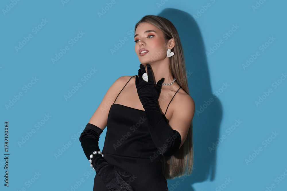 Beautiful young woman in stylish pearl jewelry on blue background