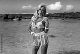 Glamorous woman in pearl bikini standing in tropical ocean water on Mauritius, luxury fashion photoshoot on exotic island beach, elegant summer style, sensual beauty and paradise lifestyle