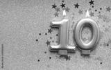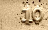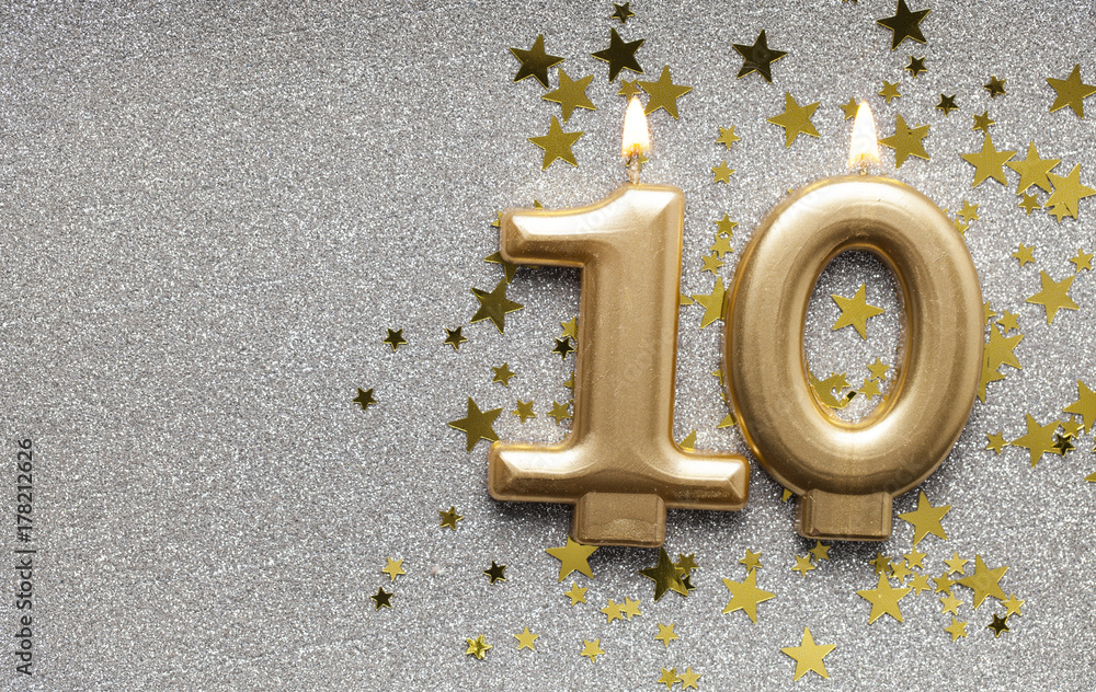 Number 10 gold celebration candle on star and glitter background