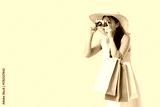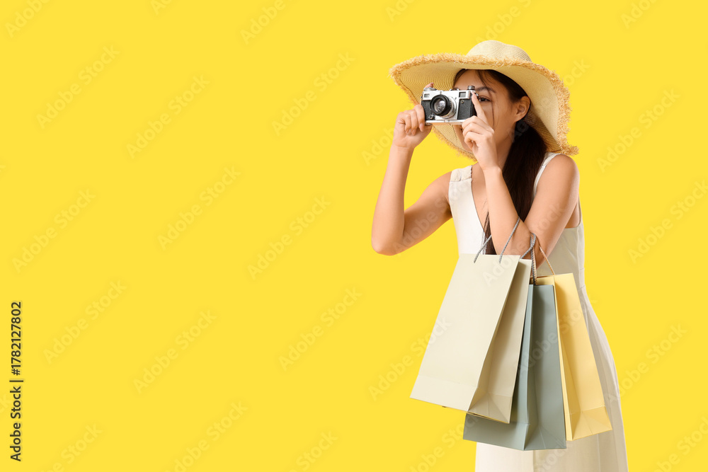 Beautiful young Asian woman with shopping bags taking photo on yellow background