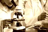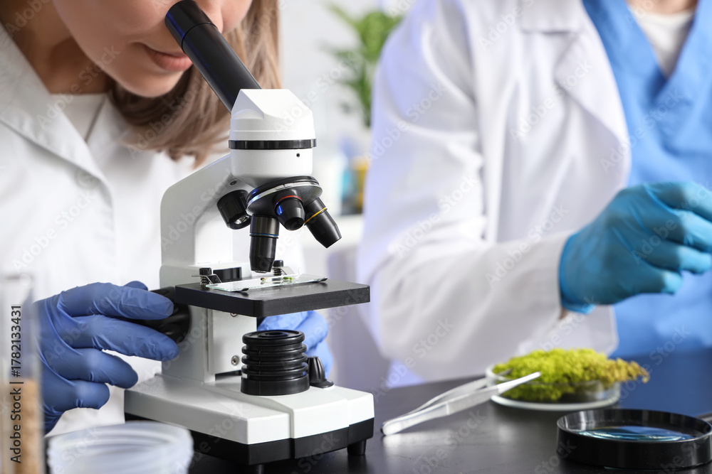 Female agricultural engineer looking through microscope in laboratory, closeup