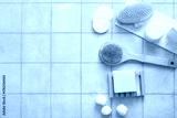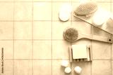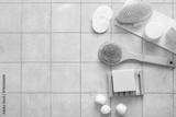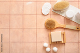 Massage brushes with cosmetic products, soap and cotton pads on beige tile background