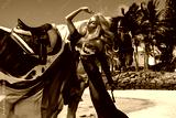 Powerful fashion woman in black sheer dress and gold metallic corset styling with pinto horse on tropical beach in Mauritius