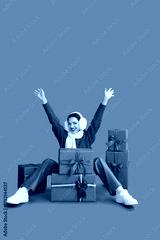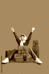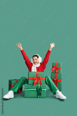 Happy young woman in earmuffs with gift boxes sitting on green background. Christmas concept