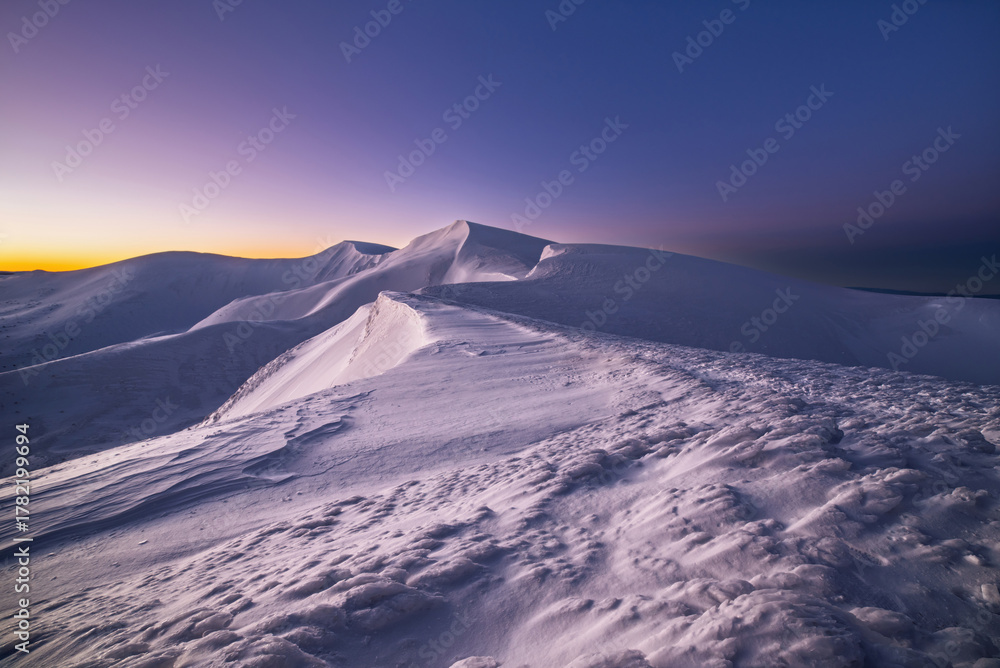 magical sunrise on a mountain peak. snowy Mountain peaks. fairytale calming landscape