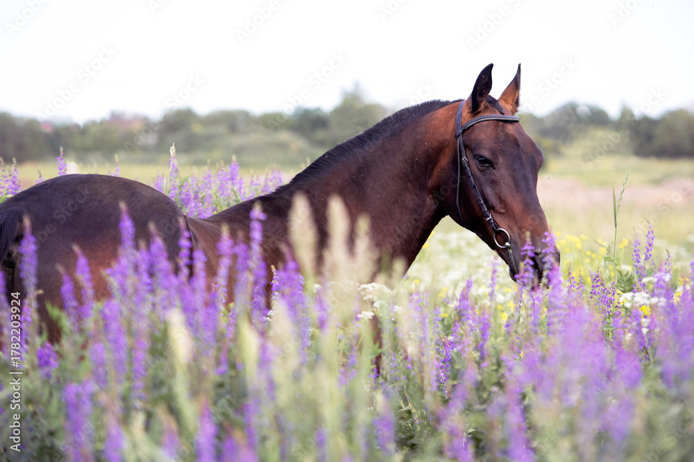 portrait of beautiful bay Akhalteke stallion posing in field around lilac flowers. cloudy day