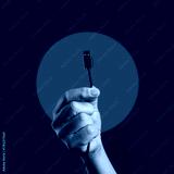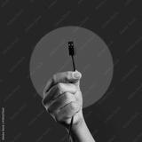 Hand holding a black USB-A cable on a graphic blue and red background.