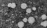 Detailed macro of light gray lichen colonies on textured rock in natural environment
