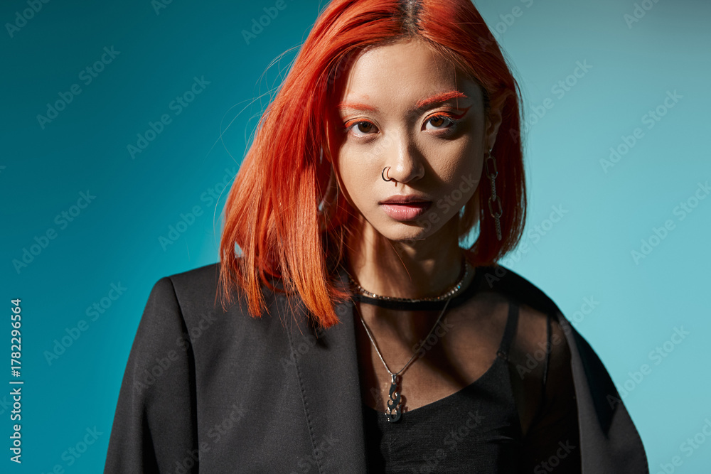 young asian woman with red hair and nose piercing posing in oversized blazer on blue background