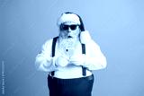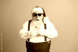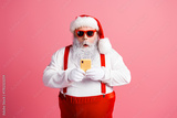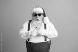 Santa in red suit with suspenders and white beard using a smartphone against a pink background for a playful festive holiday moment