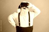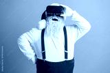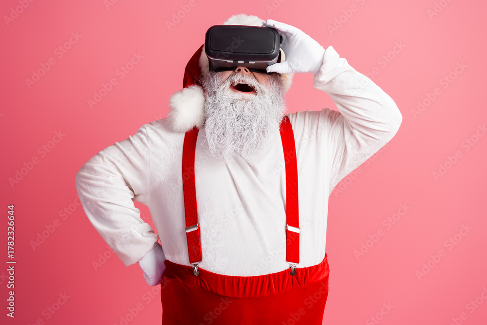 Santa in a red suit with suspenders wears a virtual reality headset and smiles against a pink background creating a festive moment