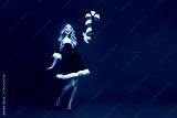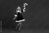 Joyful holiday moment with glamorous girl in green velvet dress holding a candy cane against a red festive backdrop