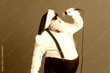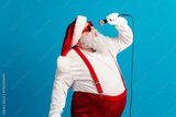 Santa performs on a blue background wearing red suspenders and hat while singing into a microphone for a festive holiday performance