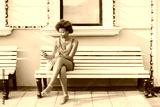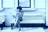 Charming young black girl is sending online message via smartphone while sitting on street bench with facade building behind her with copy space zone for text, your advert or other information