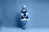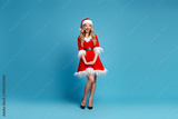 Santa helper in red fur trimmed dress with hat and belt standing against blue background for christmas stock photography