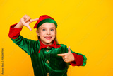 Young girl dressed as a cheerful Christmas elf pointing with a joyful expression on a bright yellow background