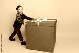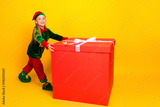 Festive Christmas elf character with a giant red gift box in a bright yellow setting, perfect for holiday advertising