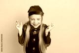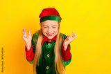 Smiling young girl dressed as a festive elf with crossed fingers in a colorful Christmas theme, yellow background
