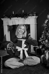 Cheerful woman sits cross legged on a red rug smiles while holding a green gift box tied with a white ribbon near a decorated Christmas tree indoors celebrating Christmas merry holiday season
