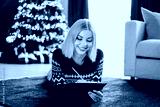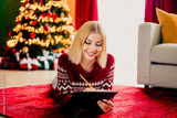Funny Christmas moment as a young woman in a red sweater writes on a clipboard by the tree with gifts at home
