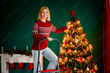 Amused woman on a ladder decorates a Christmas tree in a cozy home room with twinkling lights and festive stockings