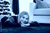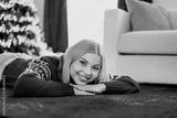 Funny cozy moment a smiling blonde woman in a red sweater lounges on a festive rug beside a Christmas tree indoors